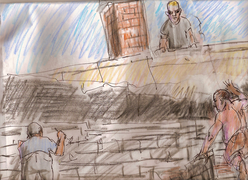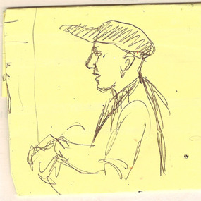 Preliminary sketch for mechanic. Eventually the truck hood proved too large and the figure was moved to face front.