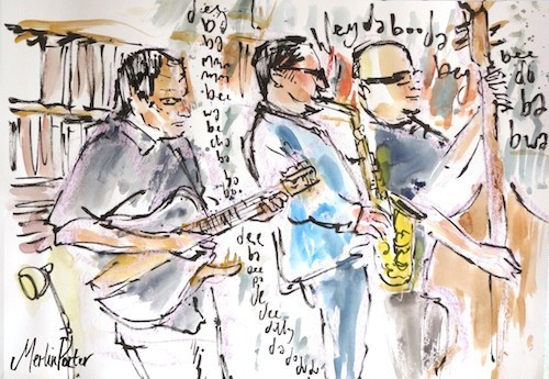 I am in love with the work of Merlin Porter. This young artist attends my concert occasionally with a paper block and a set of brushes. Merlin really manages to capture the spirit of music. Bless him..