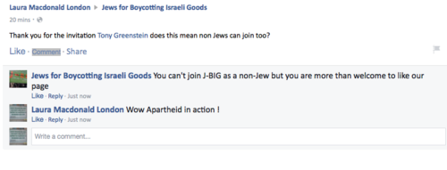 In the following Facebook exchange Muslim convert Laura Macdonald asks whether she can join the Jewish activist club. The answer is immediate and unequivocal: NO, Goyim are not welcome into our Jews only ranks (but you can ‘like’ us).