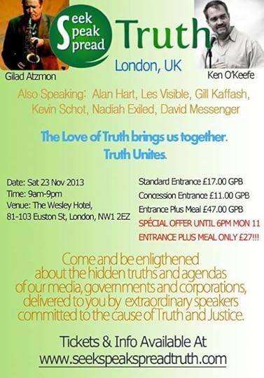 Come and be ENLIGHTENED about the hidden truths and agendas of our media, governments and corporations, delivered to you by extraordinary speakers committed to the cause of Truth and Justice – Gilad Atzmon, Ken O’Keefe, Alan Hart, Les Visible, Kevin Schot, Nahida Exiled, David Messenger, and Gill Kaffash.