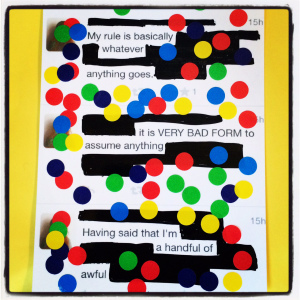 I came back to the project in October 2015. During a visit to Skye in the summer I have found some sets of coloured dot stickers in a post office. Influenced by Austin Kleon’s Blackout Poetry method (not for the first time I should add) and his advocacy of getting off-tech and going analogue I stacked up screen grabs from the Twitter app and printed them out on A6 photo-paper. Method Two was born: