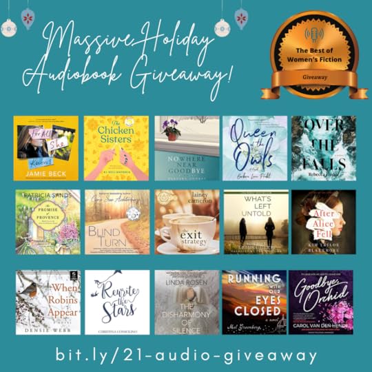 Happy holidays, everyone! I’m popping in with a quick announcement about a multi-author women’s fiction audiobook giveaway I’m participating in. The sweepstakes is being sponsored by the Best of Women’s Fiction podcast. On December 31, we will pick three winners (U.S. residents only), each of whom will win 5 of the 15 audiobooks pictured here.