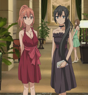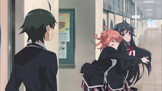 In this story, you have three main characters. The first is Hikigaya Hachiman. From the moment he is introduced, you get a clear feeling of his character. He's a pessimistic loner who dislikes everyone and has the most negative world views I have ever seen in an anime character. He tends to think a lot, and so you're often given a healthy dosage of his internal monologues, which can be quite funny at times. After him comes the second main character, Yukinoshita Yukino, the prettiest and most intelligent girl in school. Much like Hikigaya, she's a loner. However, unlike Hikigaya, she's not a longer by choice, but because pretty much every girl in school is jealous of her. She's beautiful, smart, rich. She's basically what every girl strives to be, and they despise her for that. Despite this, she has a much more positive outlook on the world than Hikigaya, and their personalities will often clash, leading to hilarious yet witty banter between them. The last main character of the bunch is Yui Yuigahama. Unlike the other two, she is not a loner, and in fact is quite popular. She's bright and cheerful and is, in many ways, sort of like a stereotypical valley girl. Or, you know, what passes for a valley girl in Japan. While at first, she doesn't seem to have much of a role other than being cheerful and somewhat annoying, you eventually begin to realize that Yui is very much the glue keeping this trio together.
