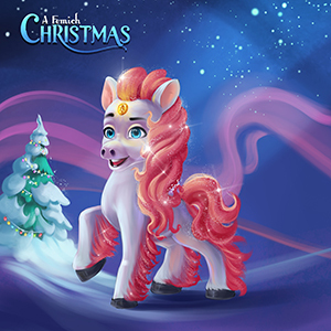 here is a character from "A Femich Christmas," this animal is called a Femich snow pony that has the ability to fly and has a gem on its head that glows giving it the ability to see when it flies at night.