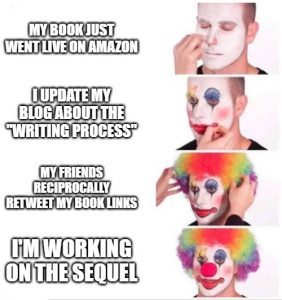 It’s nice to be part of writing groups, because they help motivate you to keep writing. If you’re writing for the ego boost, join some groups and they’ll Retweet your Amazon link. Dopamine’s a good drug. Some of your fellow writers will give you writing tips. Even personalized writing tips. If you’re smart, you’ll ignore these tips, unless they’re offered by writers who are as successful as you want to be. Don’t take advice from people who haven’t succeeded. If they knew what they were talking about, they’d be doing it already. Including me.