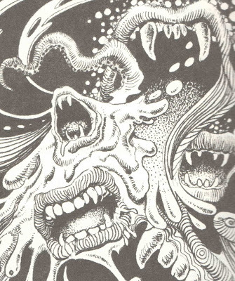 At Jim Mcleod's Ginger Nuts of Horror, George Daniel Lea dove into the Retro Zone and brought up a 1990's television show from the UK: "Consisting of on-site investigations, interviews, on-going commentary from the family affected, parapsychologists, skeptics, all presented in the familiar format of a “crime-watch” style documentary, Ghostwatch traumatised the nation with its brilliantly subtle, almost subliminal scares, by upsetting the audience's expectations and desires; their very relationship to the media in question. Not only did it present its content as factual and live, it also directly involved them in the narrative by urging them to phone in with their own accounts of the supernatural, and later as part of an unwitting mass séance created by their viewing of the show via the television."At Zombos' Closet of Horror, we got a rare look at Terrors of Dracula Vol. 2 Issue 3 from August of 1980. It's racy, raunchy, and remarkable. Put your peepers on it.The Film Connoisseur reviewed The Babadook: "I think the root of the films effectiveness comes from the fact that it plays with our fears of being a parent, of thinking our kids are weird somehow because of their particular child like behavior. Ever seen your kid grinding their teeth at night? Scary, but only because we don’t see ourselves doing it when we sleep. Children’s fear of imaginary monsters makes us think our kids are schizophrenic, truth is all kids are scared of imaginary things." (Also look at my review of The Babadook here.)William Meikle gave us a look at his past, present, and future at Nev Murray's Confessions of a Reviewer!!: "It's one of my biggest regrets that I didn't start writing until I was in my mid-thirties. Since then it's felt like I've continually been trying to catch up to where I want to be with it, and now that I'm fifty seven I can feel the pressure build as time gets ever shorter and age starts to wither both my attention span and my eyesight."Visiting Ghost Hunting Theories, we were treated to reports of spiritual visitors to the dying: "When my father had a heart attack in 1979, he was proclaimed dead by the paramedics for four minutes. During that time, he witnessed his dead parents, aunts, uncles, cousins from Norway he hadn't seen since he was a child. He was relaxed, happy, and smiling as they took him to the hospital. He truly visited them and every fiber of his being showed it. Days later he did die, and I have no doubt at all he went to his relatives, but before he did, he visited me at the time of his death. That kind of visitation is called 'after-death visitation.'"Here, I brought you from truth to fiction to truth, and pointed you to some novella reviews I wrote for Ginger Nuts of Horror.Illustration by Frank Brunner for Chaosium's Stormbringer 4th Edition Rulebook.
