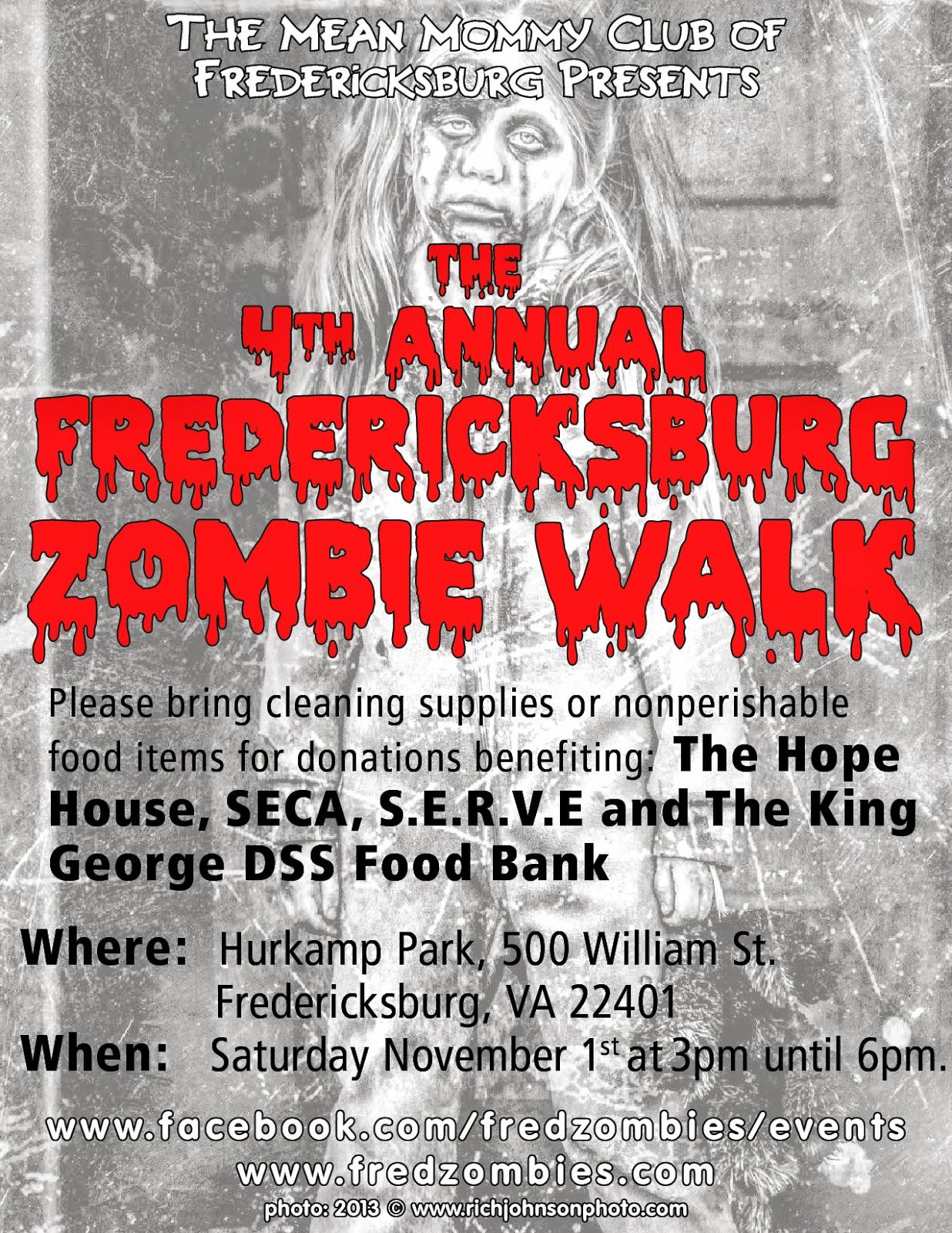 This year's Fredericksburg Zombie Walk will be held on Saturday November 1, 2014 at Hurkamp Park, 500 William Street, Fredericksburg VA 22401, from 3:00 pm to 6:00 pm. Please bring a non-perishable food item, cleaning supplies, or a charitable donation. There'll be prizes and contests and all sorts of fun.