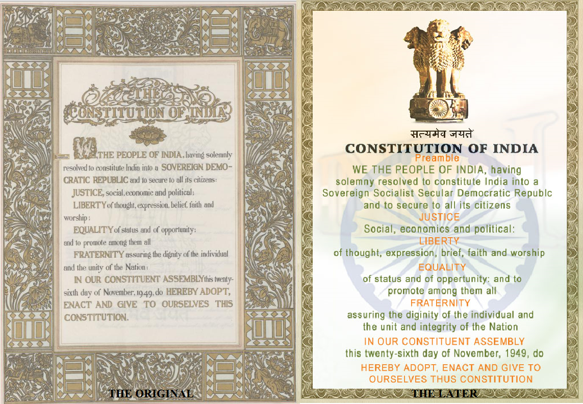 இந்தியாவில் எமர்ஜென்ஸி என்றழைக்கப்பட்ட அவசர நிலைப் பிரகடனம் அமலில் இருந்த போது கொண்டு வரப்பட்ட 42வது சட்ட திருத்தத்தின் மூலம் ‘Secular’, ‘Socialist’ ஆகிய சொற்கள் அரசியல் சாசனத்தின் முகப்புரையில் நுழைக்கப்பட்டன. இந்திய ஒன்றியம் “SOVEREIGN SOCIALIST SECULAR DEMOCRATIC REPUBLIC” ஆனது. 2 நவம்பர் 1976 அன்று கொண்டு வரப்பட்ட இந்தச் சட்ட திருத்தம் தான் இந்தியாவில் இதுவரை மேற்கொள்ளப்பட்ட 101 சட்ட திருத்தங்களில் மிக அதிகப் பிரிவுகளை மாற்றியதும், மிக சர்ச்சைக்குள்ளானதும் ஆகும். அந்தச் சட்ட திருத்தத்தை ஒரு ‘குட்டி அரசியல் சாசனம்’ என்றே சொல்வார்கள். மத்திய அரசின் பலத்தை உச்ச நீதிமன்றத்தை விட அதிகமாக்குவது, மாநில அரசு அதிகாரங்களைக் குறைப்பது போன்ற நோக்குகளுடன் கொண்டு வரப்பட்ட அந்த மாற்றங்கள் இந்தக் கட்டுரைக்கு அவசியமற்றது என்பதால் நாம் சாசன முகப்புரையில் செய்யப்பட்ட மாற்றத்தைப் பற்றி மட்டும் கவனிக்கலாம்.