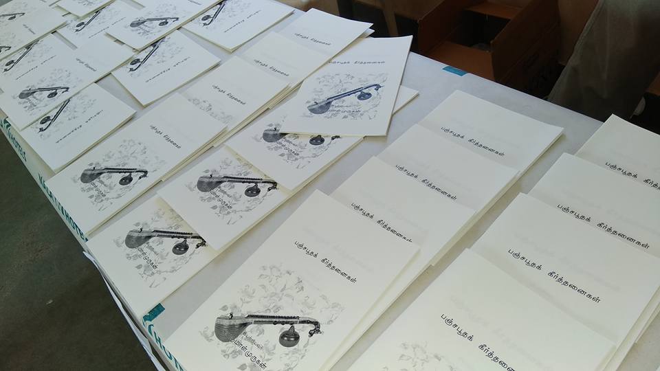 நேற்றைய நாமக்கல் தமிழிசைக் கச்சேரியில் பெருமாள்முருகன் இயற்றிய பஞ்சபூதக் கீர்த்தனைகள் புத்தகமும், தமிழ் மின்னிதழின் இளவேனில் 2017 டீஸரும் வெளியிடப்பட்டன. பஞ்சபூதக் கீர்த்தனைகள் 20 பக்கம் கொண்ட சிறுநூல். விலை ரூ.10. காலச்சுவடு வெளியீடு. பெருமாள்முருகன் எழுதிய 10 கீர்த்தனைகளையும் 4 விருத்தங்களையும் உள்ளடக்கியது. அதிலிருந்து ஏழெட்டு கீர்த்தனைகளையும் இரண்டு விருத்தங்களையும் டிஎம் கிருஷ்ணா நேற்று மேடையில் பாடினார்.