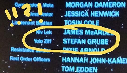 Speaking of characters... During the final X-wing battle, I was shocked to see my good friend Stefan on screen as the pilot Yolo Ziff. At first I thought I had imagined it but then he was on a second time, with a big line (something like, "Looks like there's a new hole in that oscillator!") The second time, I was sure it was him, and so I was keeping an eye out for him during the credits. SURE ENOUGH: