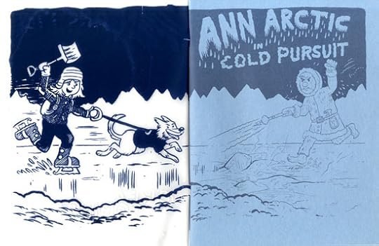 Above is the cover for the book, which is quite possibly the craziest screen printing I've ever seen (dreamed up by bookmaking mastermind Jon Chad). Basically, the class invented an ice planet for our story, so we used blue paper with a vellum overlay that was screen printed with white ink on one side (not shown) and blue ink on the backside. The main character is seen skating through the snow on the cover, but when you open it up, she's racing towards The Sweaty Yeti (our bad guy). It's always really fun to jam out these covers while the students are creating the story. I think it might have been our best one yet!
