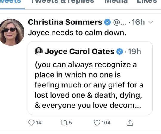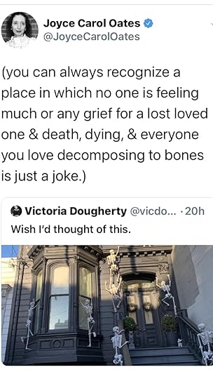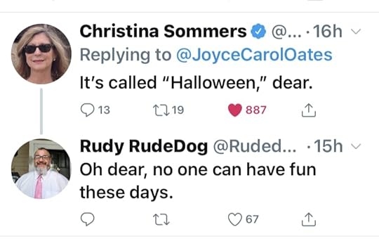 To my surprise, this run-o-the-mill tweet went viral, attracting thousands of “likes” and “retweets” over a couple of days. Stranger still, two women I admire – feminist author and scholar Christina Hoff Sommers and literary queen Joyce Carol Oates, no less, got into a minor skirmish about this simple little photo and comment about Halloween decor.