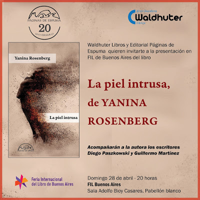 Domingo 28 de abril a las 20 hs. presentación sobre "La piel intrusa" de Yanina Rosenberg, con Diego Paszkowski en sala Adolfo Bioy Casares.