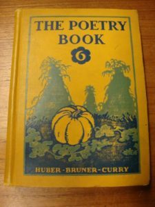 When I was a child, my mom used to read poetry to us, especially from an orange book that had been a sixth grade school book published in 1927. My sister took it when her son was young and read to him from it; I “inherited” it when my children were young. (My daughter has called dibs on it.) We have no idea where Mom got it. It was published and used in schools before she was born.