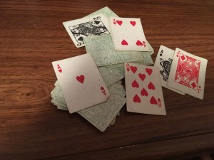 We played cards in high school, too, even though we weren’t supposed to. Our favorite games was one we called Sit and Bull$#!+. When my mom taught it to us, she called it ‘I Doubt It.’ I’ve also heard it called ‘Liar’ or ‘Cheat.’ I had a deck of tiny cards we could hide in our hands. I still have most of the deck.