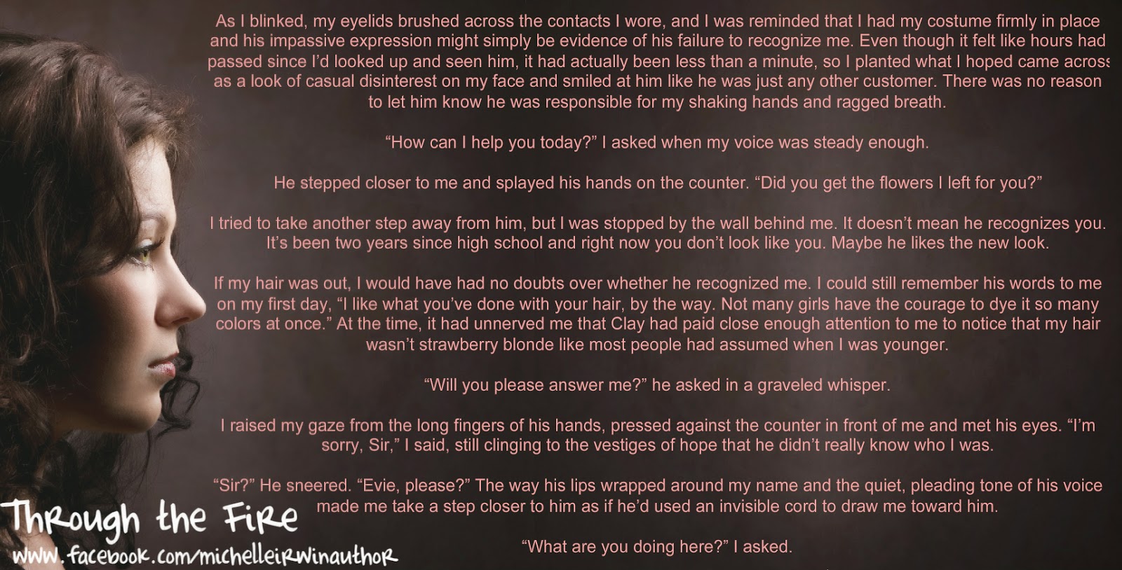 I thought I'd put together a little post with all the teasers so far for Through the Fire, if you haven't already, maybe you can add it to your Want to Read shelf at Goodreads and if you haven't already you can become a fan here (or better yet, add me as a friend, I won't bite...unless you ask nicely). I have also posted all of these into a Facebook album to make it easier for viewing click here for that.