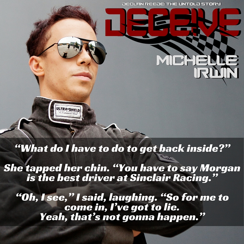 After we stood like that for a few more minutes, I decided the mood had been too heavy and serious for too long. I owed it to Alyssa to let go of my stress for a while so that I could show her a good time tomorrow. With Alyssa in mind, I twisted my body, grabbing Eden into a headlock and mussing up her hair.“Declan, you jackass!” she squealed, trying to yank herself from my arms. “We almost had a grown-up moment then.”“I know, Edie,” I said. I let her go and ran back inside the room. I glanced around it—I still had find a way to get rid of the images of Alyssa the morning after the school formal, but Eden was doing a good job of keeping me sane at the moment. “So, what have you got planned for tonight?”“Dinner at the Sunshine Room, and then daiquiris at the casino.” She grinned widely. “Eden, you know I’m a dude right? This—” I grabbed my crotch. “—qualifies me as such. Dudes don’t do daiquiris. Those are girly drinks.”“Oh, but look at those pretty locks of yours, Dec.” She jumped up and grabbed a handful of my hair, which was rapidly getting out of control without my regular trips to get it cut. “I’m sure I could put a nice barrette in there, maybe slip you into a turquoise dress to match your eyes. With your inch-long lashes and pretty pout, I think you’d make a hot chick.”I scowled at her. “You know you are just about the right weight for me to pick up and toss over that balcony.”She smirked at me. “I’d like to see you try.”I feigned a shrug and walked away, before quickly running back at the last minute and throwing her over my shoulder. I carried her back outside and sat her on the railing, with my arms wrapped around her to ensure she didn’t accidentally slip.“Declan Reede, you fucking arse, let me down,” she screamed as she clung tightly to my shoulders, squeezing her eyes shut. “You know I hate heights.”“What were you saying about me?”“That you are a manly man who has no feminine aspects at all.”“Exactly,” I said, before pulling her back off the balcony rail. I flipped her around me and put her back on her feet. She smacked my chest before running into the room. Before I could follow her inside, she slid the door shut and locked it. She stood on the other side of the glass and poked her tongue out at me.“Oh, you are going to get it, Edie!” I shouted.She pretended she couldn’t hear me, making ridiculously overemphasised gestures of cupping her ears.“All right, you’ve had your laugh,” I said. “Now, let me in.”She shook her head and laughed.I clasped my hands together and held them in from of me. “Please?” I begged, pushing my bottom lip out.“Uh-uh.”“What do I have to do to get back inside?”She tapped her chin. “You have to say Morgan is the best driver at Sinclair Racing.”“Oh, I see,” I said, laughing. “So for me to come in, I’ve got to lie. Yeah, that’s not gonna happen.”