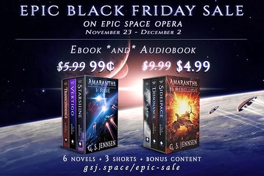 Now about that sale. From now through next Tuesday—Black Friday, Cyber Monday and everything in between—the first two omnibus collections in the Amaranthe saga are on massive sale over at my store. Get AMARANTHE I: RISE (3 huge novels, 2 short stories plus bonus materials) for all of 99 cents, plus AMARANTHE II: REBELLION (3 more novels and a short story plus yet more bonus materials) for 50% at $4.99. Tell your friends, and get them utterly hooked on this universe.