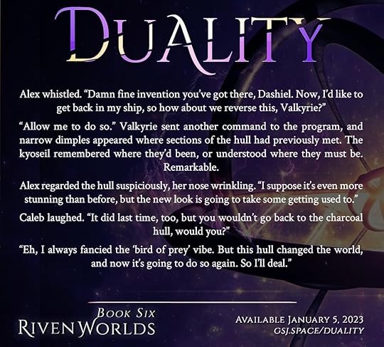 DUALITY, the finale of the Riven Worlds series, will be released on ** JANUARY 5, 2023. ** I’d hoped to get it to you in time for Christmas, but so much Real Life intervened.