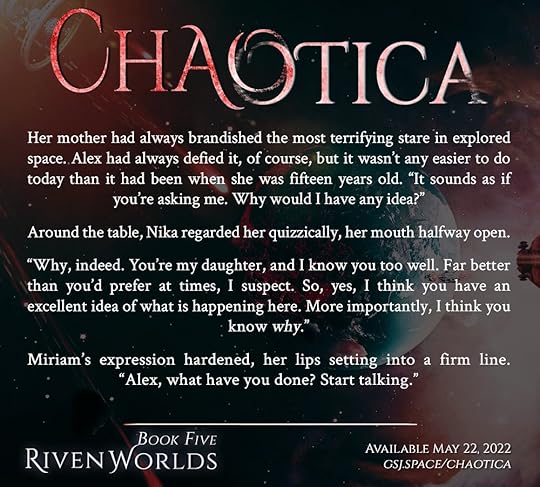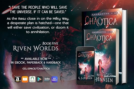 The wait is almost over! CHAOTICA, Book Five in the Riven Worlds series, will be released on ** MAY 22, 2022 **. You can pre-order it today at all major online retailers, as well as direct from my online store. You can also add it to your Goodreads “Want to Read” shelf here.