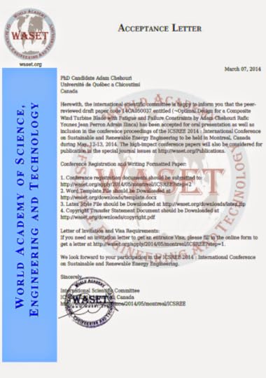 So please if you've submitted your paper to this conference (Montreal 2014 May 12, 14) under any conference name or subject, consider reviewing your decision. And if you are considering to attend a WASET conference in the future, please note that I have no intention of attacking any party or organizing committee, but as a researcher and a first year PhD student I know that hard work goes into writing a paper ad no one wants their work wasted in the end. Lastly, I would like to share with you this number 17 847. That is the number of paper that have been published from previous conference since January 2007. Now if my math is correct, that in more than 400 papers per conference assuming one conference per month since January 2007. This shows you the level of paper reviewing and its credibility (if there is any !!!).