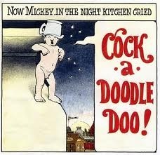 The book has been challenged by social-religious conservatives since its publication, most often on the basis of the illustrations, some of which depict the central character, Mickey (right), a boy about three or four years old, naked—and anatomically correct. In the course of the story, Mickey dreams that he hears a noise below him, on the first floor of the house. He floats out of bed and down to the "night kitchen," losing his bedclothes in the process. The bakers in the kitchen, who all look like Oliver Hardy, need milk for the "morning cake," and Mickey resolves to get some for them. He finds a giant milk bottle, which he falls into but eventually delivers to the bakers. Then he crows like a rooster, slides down the bottle, and is magically returned to his bed. This is a perfectly innocent dream story, right?