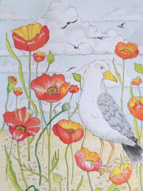 The waves settled down, and the sun rose. Far off I could see the gulls swooping, and one landed in a field of poppies and smiled at me.