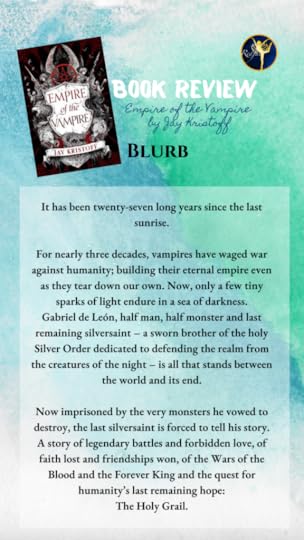 Blurb for Empire of the Vampire by Jay Kristoff My thoughtsThe story is told as if Gabriel is being interviewed, but in a way that is fully immersive. Gabriel De Leon is the MC, raised by his human mother but once he’s a teen he discovers he’s half vampire. He’s taken by the Holy Order to train to kill the vampires.