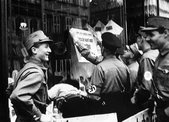 Miembros de las SA nazis ponen carteles racistas en el escaparate de un comercio judío en abril de 1933 (GETTY)