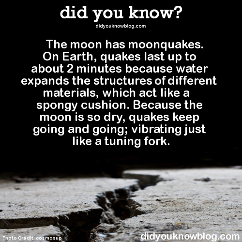 The moon has moonquakes. On Earth, quakes last up to about 2 minutes because water expands the structures of different materials, which act like a spongy cushion. Because the moon is so dry, quakes keep going and going; vibrating just like a tuning fork. Source