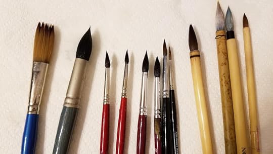 Left to Right: Cotman Mop, Creative Mark Mimik, Blick Master Squirrel, Blick Master Squirrel, Creative Mark Squirrel, Creative Mark Squirrel, Creative Mark Rhapsody, Utrecht Red Sable, Wolf Sumi Brush, Goat Sumi Brush, Goat Sumi Brush, Weasel Sumi BrushI personally recommend a mix of synthetic and natural fiber brushes in any watercolorist's collection, as both can serve valuable purposes. For artists on a budget, I recommend reserving the nicer natural hair brushes such as Kolinsky for just one or two brushes and using squirrel or sumi brushes for the rest of your natural brush needs. A nice brush is an investment and will last for years if well cared for.