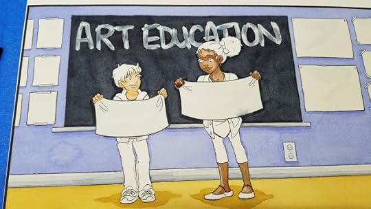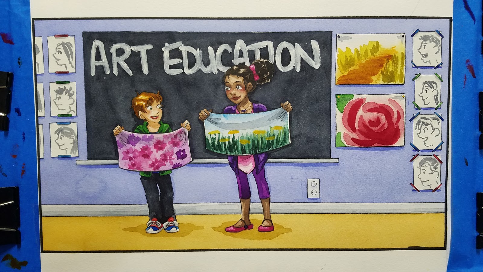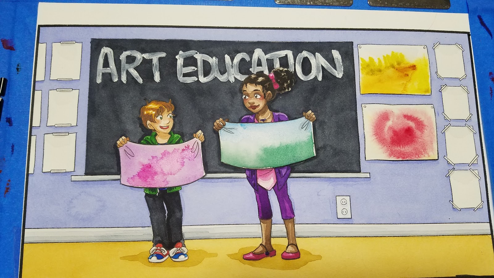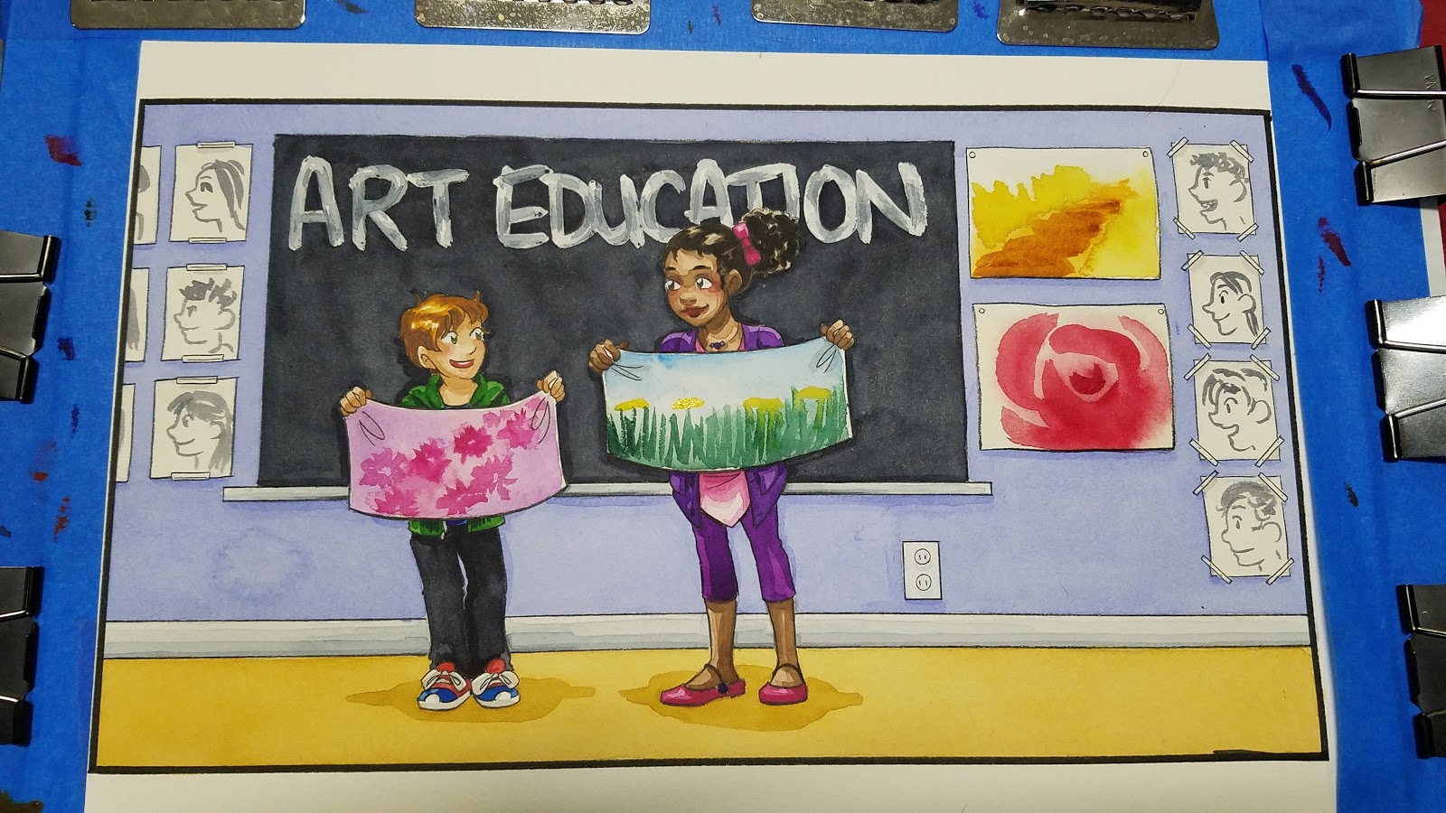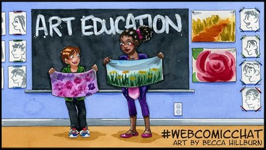 Recently, I was selected to submit questions to Webcomic Chat based on participants experiences with art education, both in a formal setting and through self guidance, as part of a program to promote the NATTO scholarship. Since I was tapped to submit questions, I was also given the opportunity to create the promotional art for this chat. In the past, I've done two other illustrations for Webcomic Chat- one for Self Promotion and one for Kidlit Comics, and it was a pleasure to create another watercolor illustration for a topic I treasure.