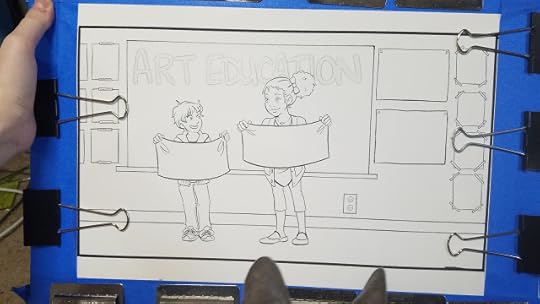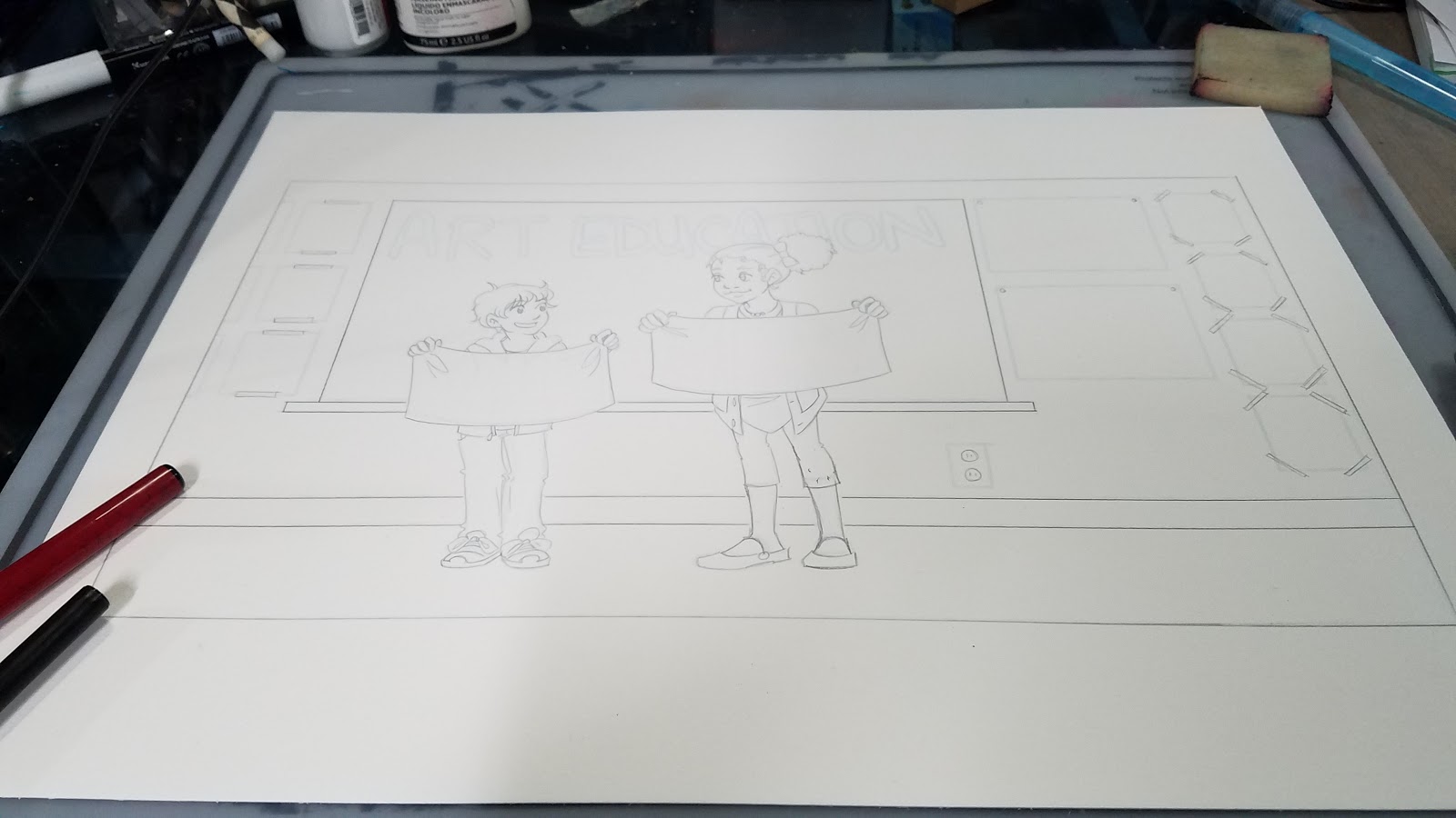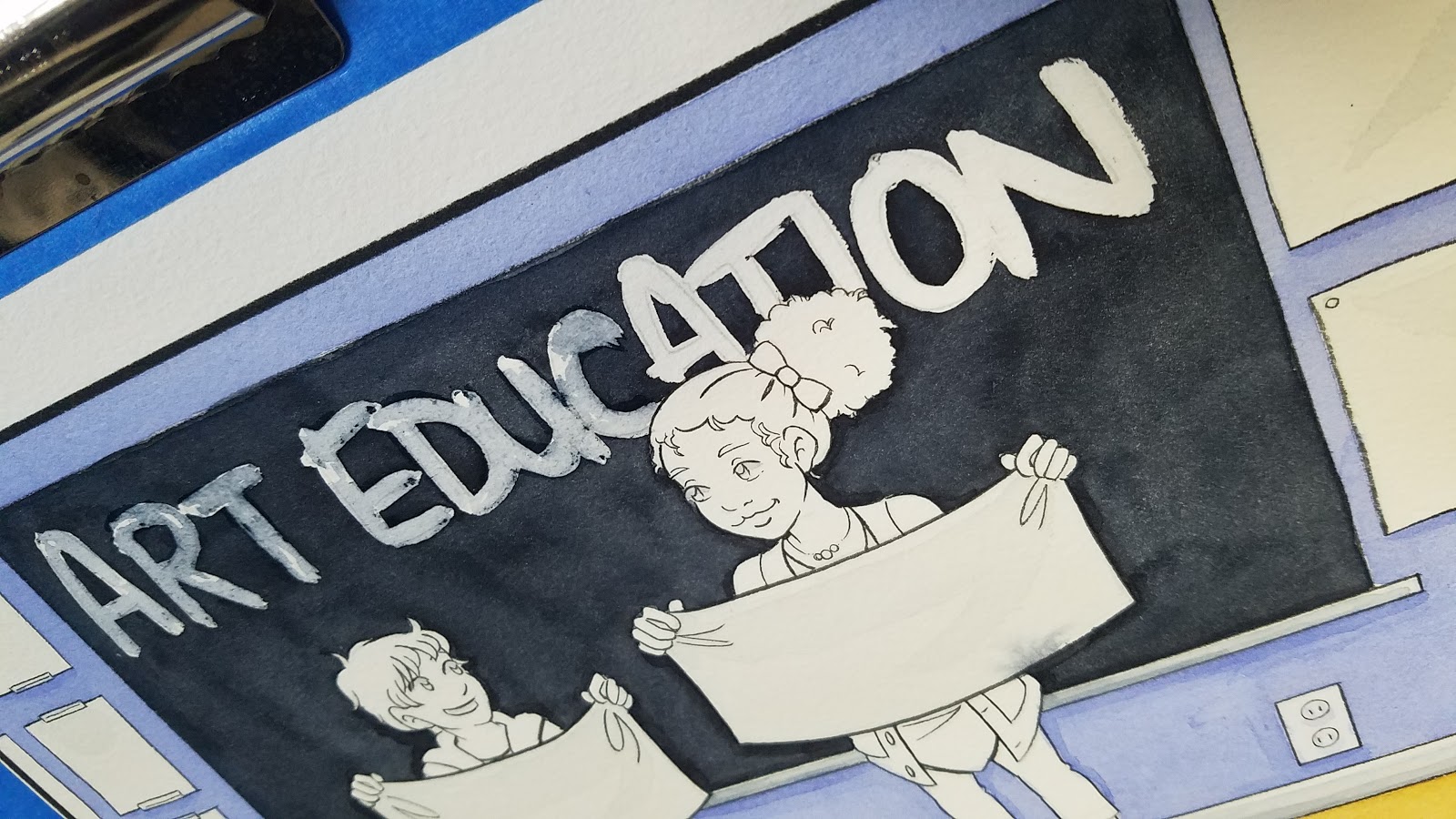 I left the phrase 'Art Education' uninked, since I want to imitate chalk on a chalkboard, and thought the inked outline would be too harsh. As stretching the watercolor paper will remove the blue guidelines, I penciled Art Education onto the chalk board, so it would remain visible.
