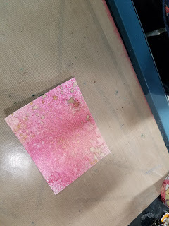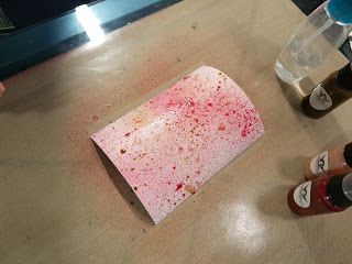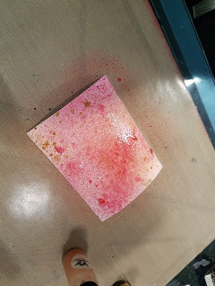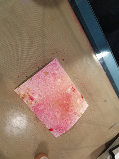 Qor Quinacridone Gold diluted in water and spritzed onto background.