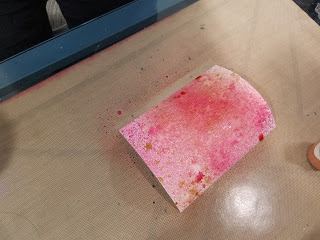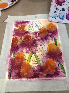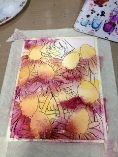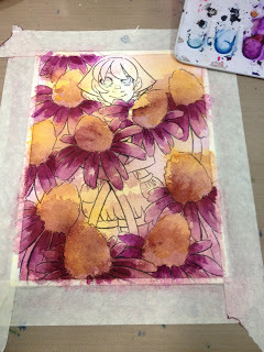 Once I've achieved the color depth I'm looking for, and the paper has fully dried, I use a masking fluid eraser to pick up the masking fluid. For best success with masking fluid, I find it best to remove it as soon as possible- this fluid sat on the page for only a couple days.