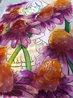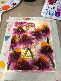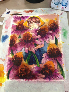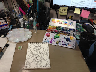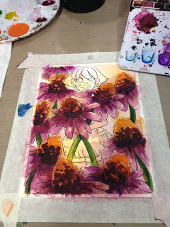 When inking the border, my hand slipped. This is something that can't be corrected with traditional media until after I've watercolored the piece- if it can be corrected at all.