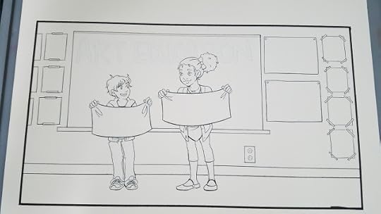 Once most of the illustration has been completed, I start adding in small environmental details. Since this is an art classroom, I have an opportunity to create mi nature works of art. The goal is to make pieces that could feel like they were made by young students.