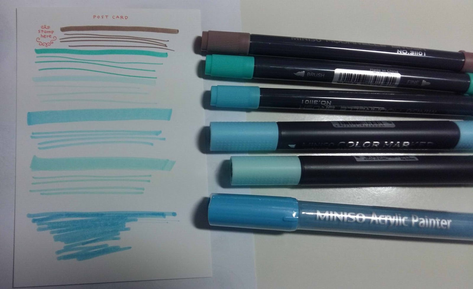 Here is the compiled look of all the supplies, tested on that postcard paper. Cool note is the alcohol based marker didn’t bleed through to the other side, just barely started to. Might be good for all those people who use a lot of alcohol based markers.