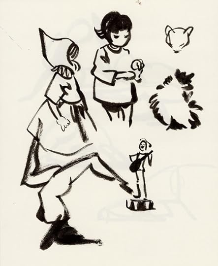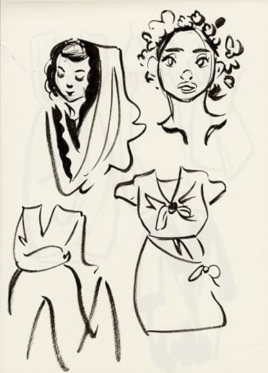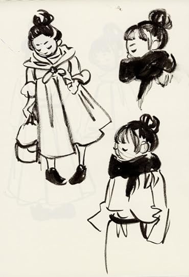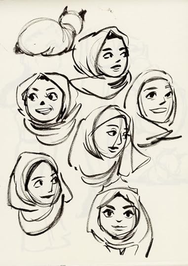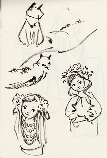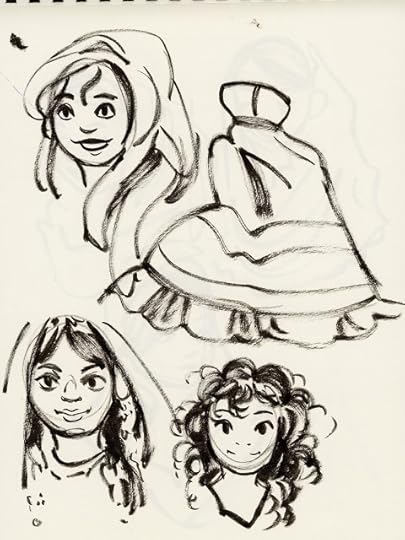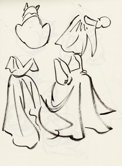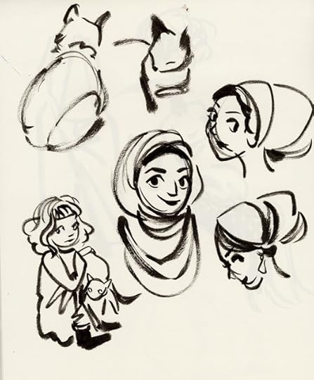 For almost every day in October, I tried to fill three pages with warmup sketches, all done with a Pentel brushpen. Loose, gestural, and often full of mistakes, these sketches were intended to help me practice folds, figures, and faces without relying on construction. Rather than subject you to 60 pages of sketches, I thought I'd share the highlights here.