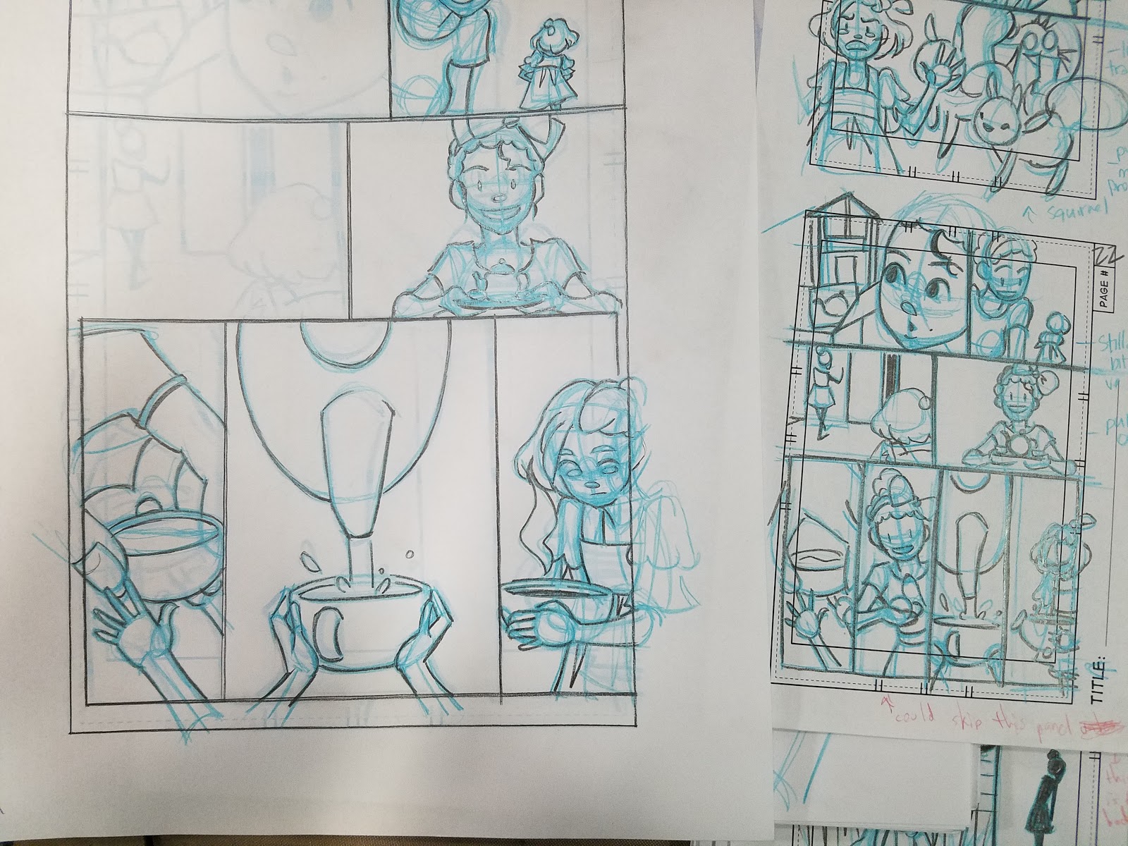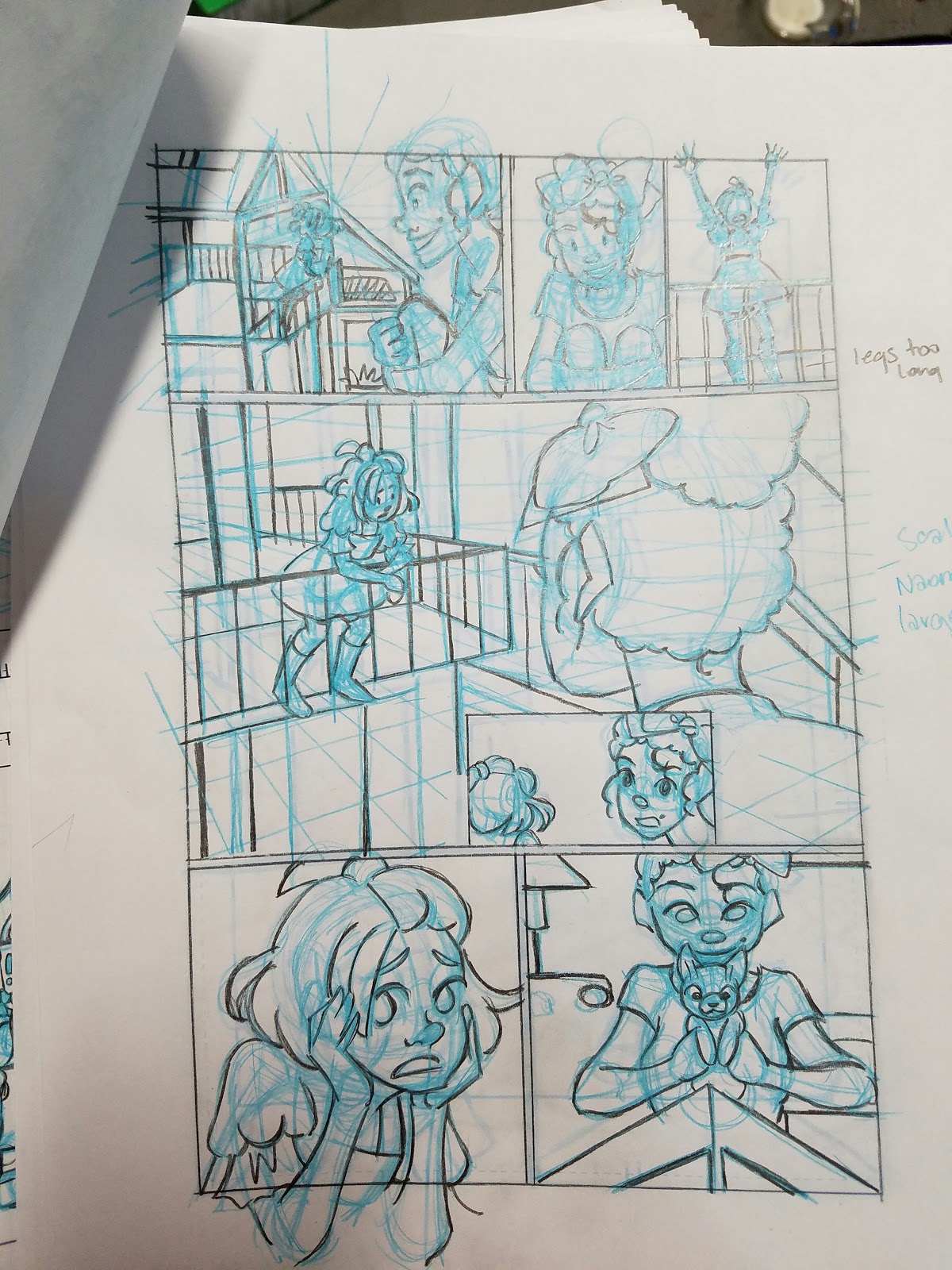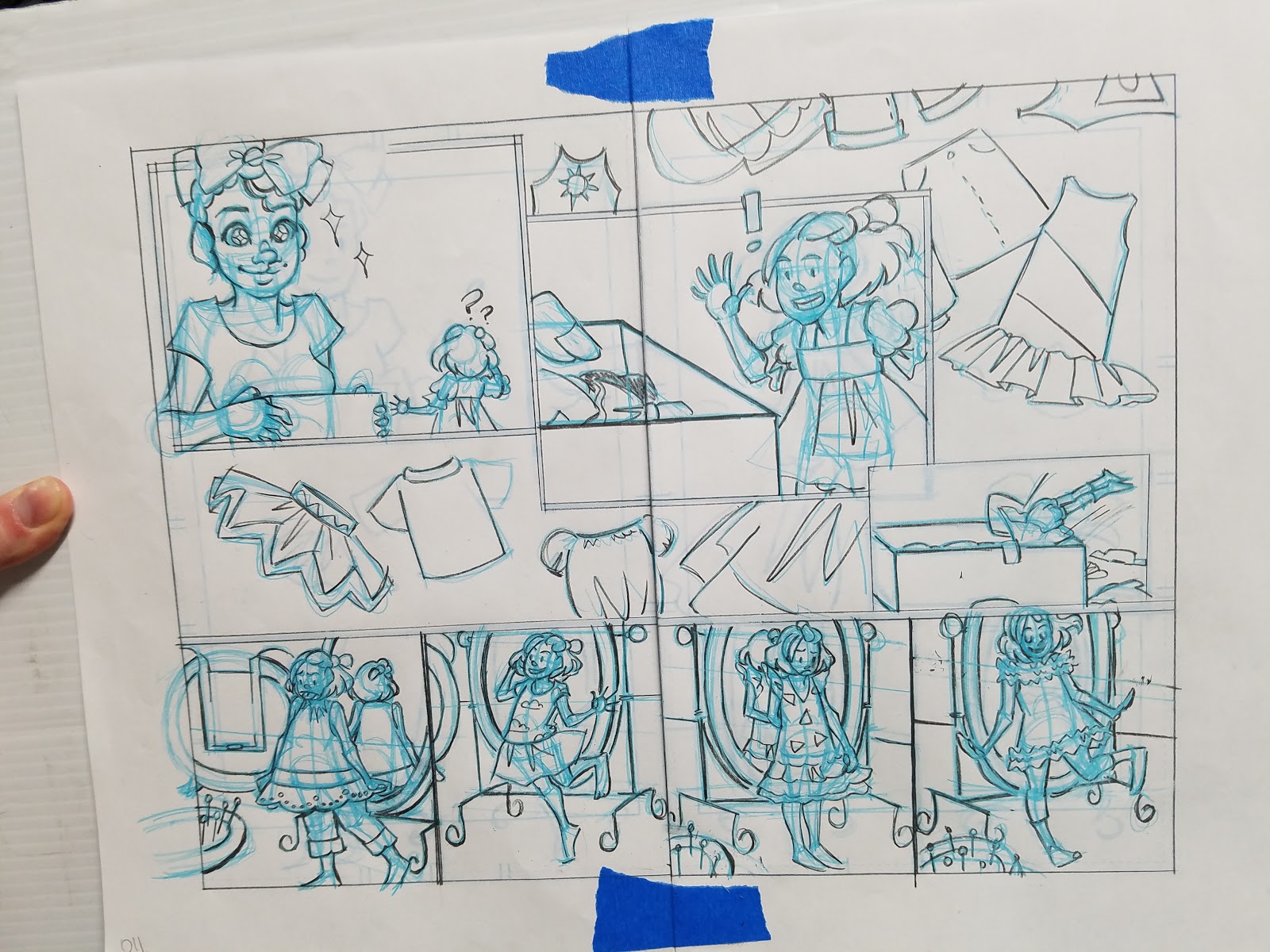 I start out my whole process with a rough outline (mostly in my head), and I draw the thumbnails. I do most of my detailed writing and solid dialogue while I thumbnail, seeing the flow of the page helps me think of how actions will play out in more detail. The thumbnails are also pretty scribbly because I’m trying to get ideas out quickly. I want to spend the majority of my time on the finished pages. My process for this part has stayed pretty much the same over the years, except now I thumbnail with page layouts in mind.
