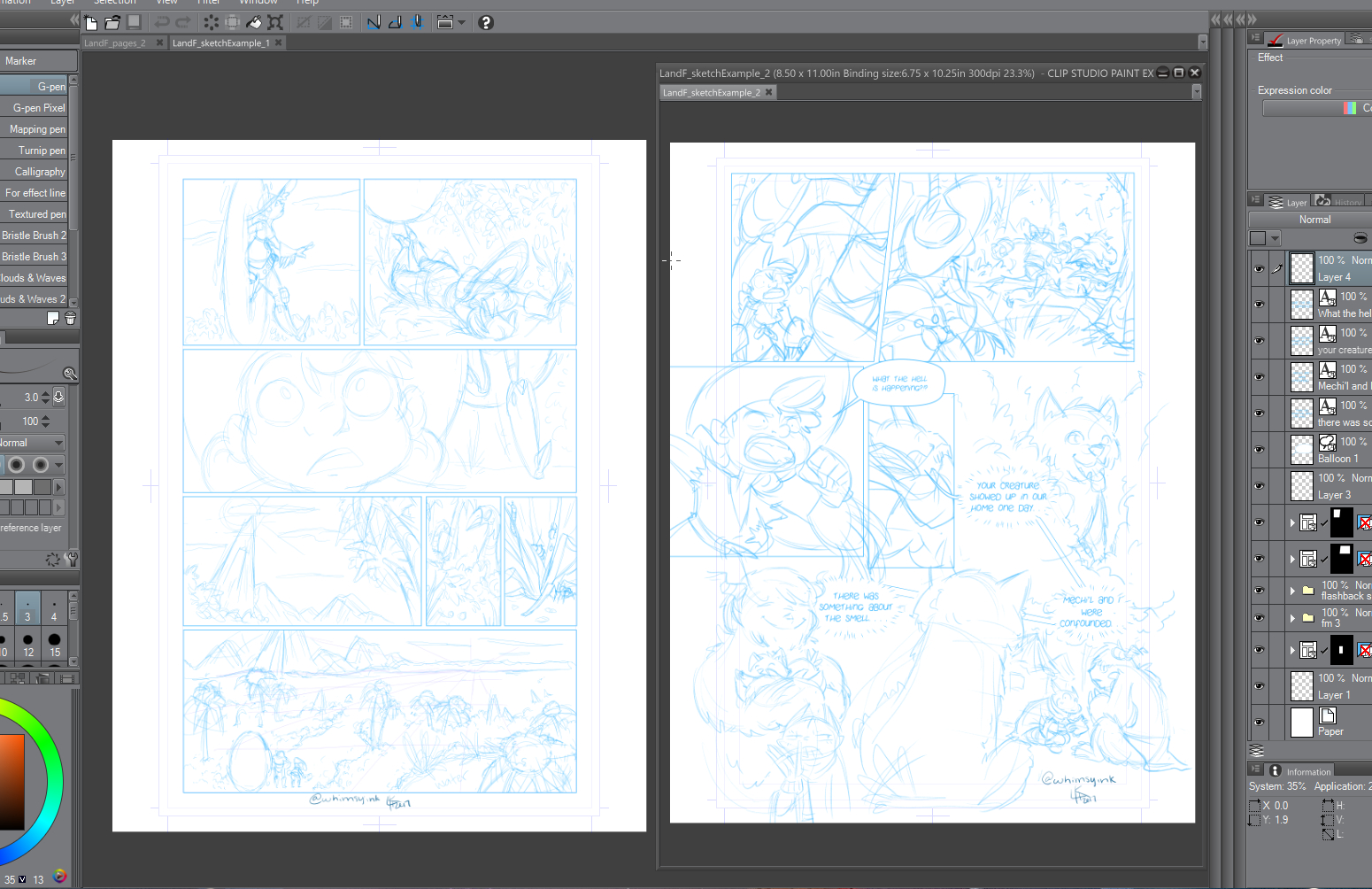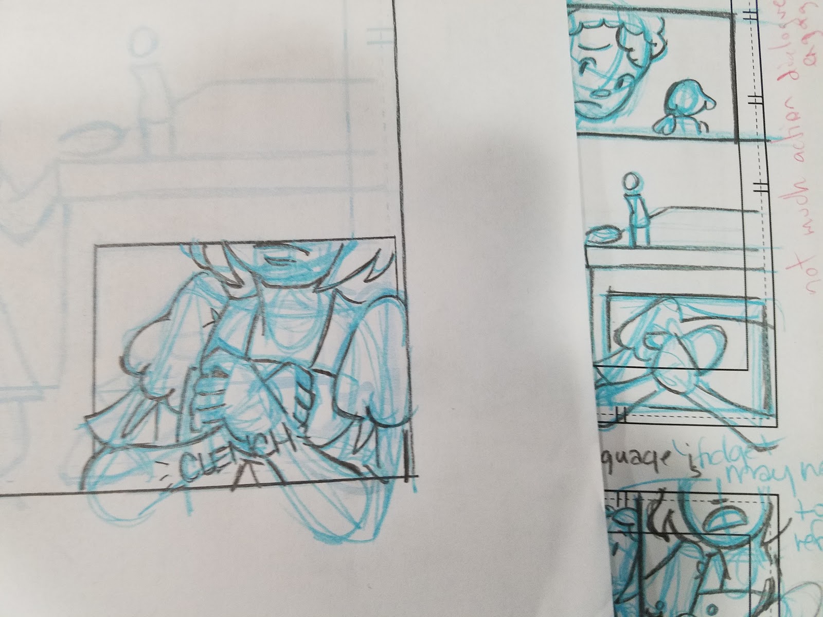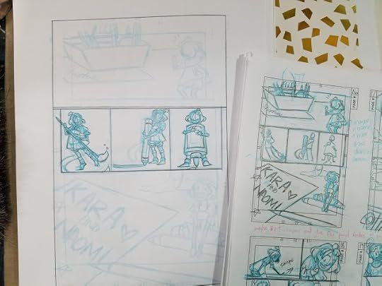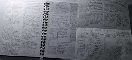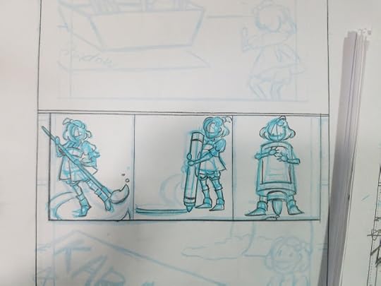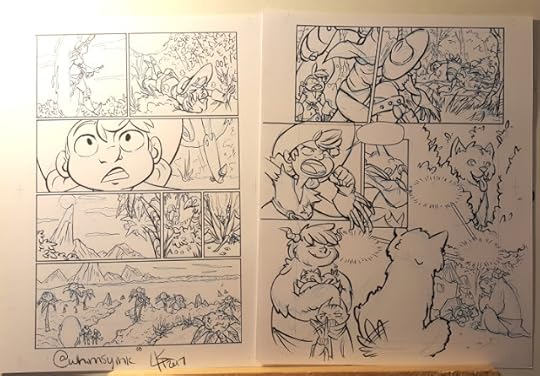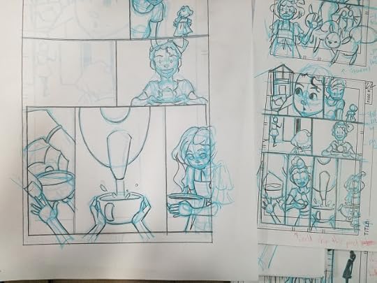 I start out my whole process with a rough outline (mostly in my head), and I draw the thumbnails. I do most of my detailed writing and solid dialogue while I thumbnail, seeing the flow of the page helps me think of how actions will play out in more detail. The thumbnails are also pretty scribbly because I’m trying to get ideas out quickly. I want to spend the majority of my time on the finished pages. My process for this part has stayed pretty much the same over the years, except now I thumbnail with page layouts in mind.