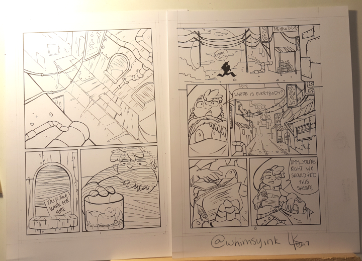 Once again, I started with my scribbly thumbnails, and then moved on to the sketching stage. I got Clip Studio pretty early on in making the second issue, and I really like the program for making comics and other illustrations. It’s nice, because it has a lot of tools specific to making comics, so it makes parts of the process more streamlined. Also, drawing digitally in Clip Studio feels much closer to drawing traditionally for me than a lot of other programs I’ve found. So that’s exactly what I did for Issue 2; I drew everything digitally, and then printed it out to ink it traditionally.