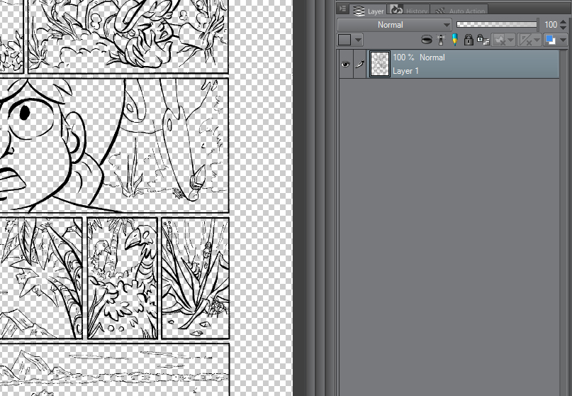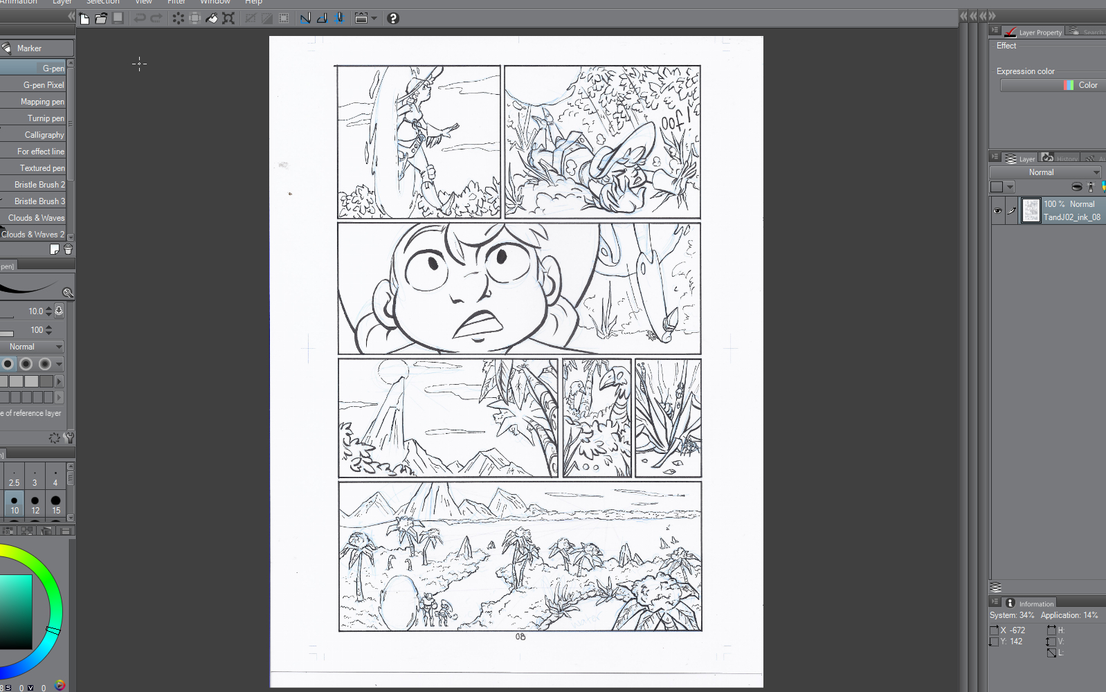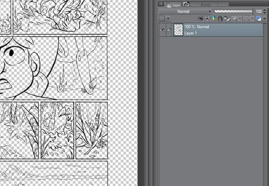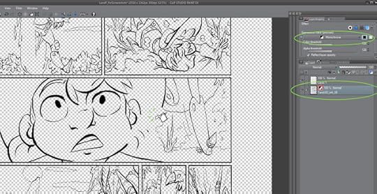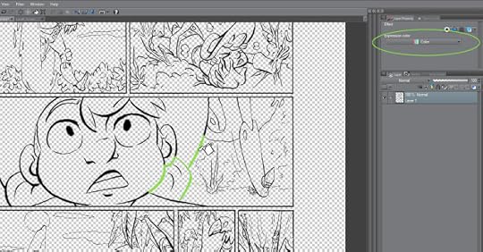 This also helps me do flat colors, because I can make the Ink layer a Reference Layer using a handy little toggle in the upper part of the Layer menu. This makes all of the black lines solid barriers, so when I fill in solid colors it won’t bleed past the black ink lines!
