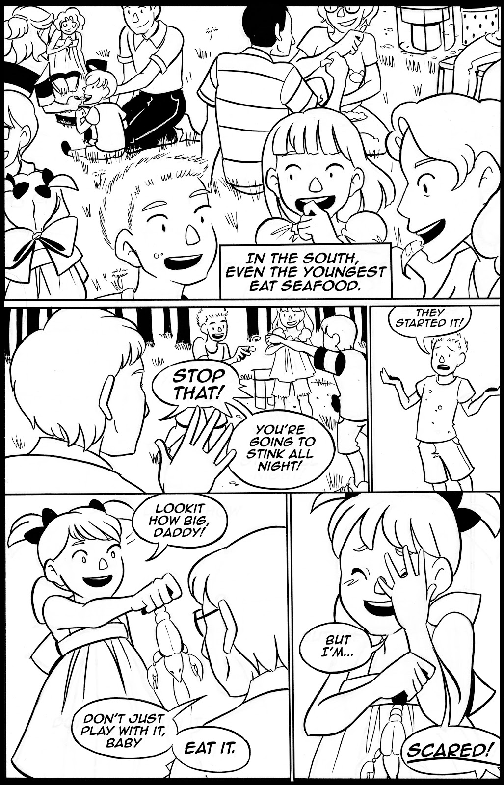 After I finished inking, I scanned everything in and removed the colored lines digitally. This was much easier that erasing all of the pencil after inking every page, plus there wasn’t as much risk of smearing the ink. I also like the look of the sketch under the ink, it’s fun to look back at and see where I’ve come from in terms of drawing improvement.