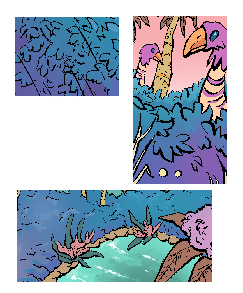 I started to heavily use this effect on the base color layers underneath the Multiply layer instead. I thought it worked especially well with the bushes and trees in the alternate world in the second issue. I would lay down gradients and then take the Pen Tool and draw pen strokes on top to break it up and create foliage, bark, or other effects.