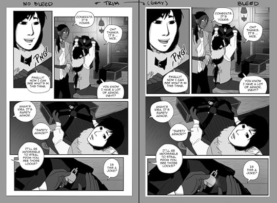 A bleed area is the very edges of your page, where it’s alright if something gets cut off at the printer. It’s very useful when you want your art to just flow off the page.