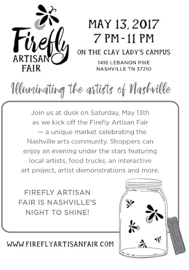 The Firefly Artisan Fair is Saturday, May 13th, from 7PM-11PM on the Clay Lady's Campus (1416 Lebanon Pike, Nashville TN 37210).