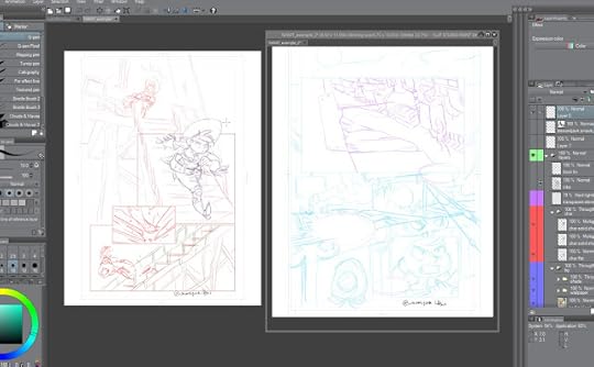 This whole thing started as an experiment in 2014: I wanted to try and repaint a digital painting I’d done in 2011 and decided to do it in a comic because I enjoy narrative art, I wanted to see how well I could hold to an update schedule, I wanted to experiment with different techniques for making comics so I’d be ready to make a longer story that I’ve wanted to tell for a long time. Due to the experimental nature of the whole thing, the process I go through to create each page has changed in every issue.