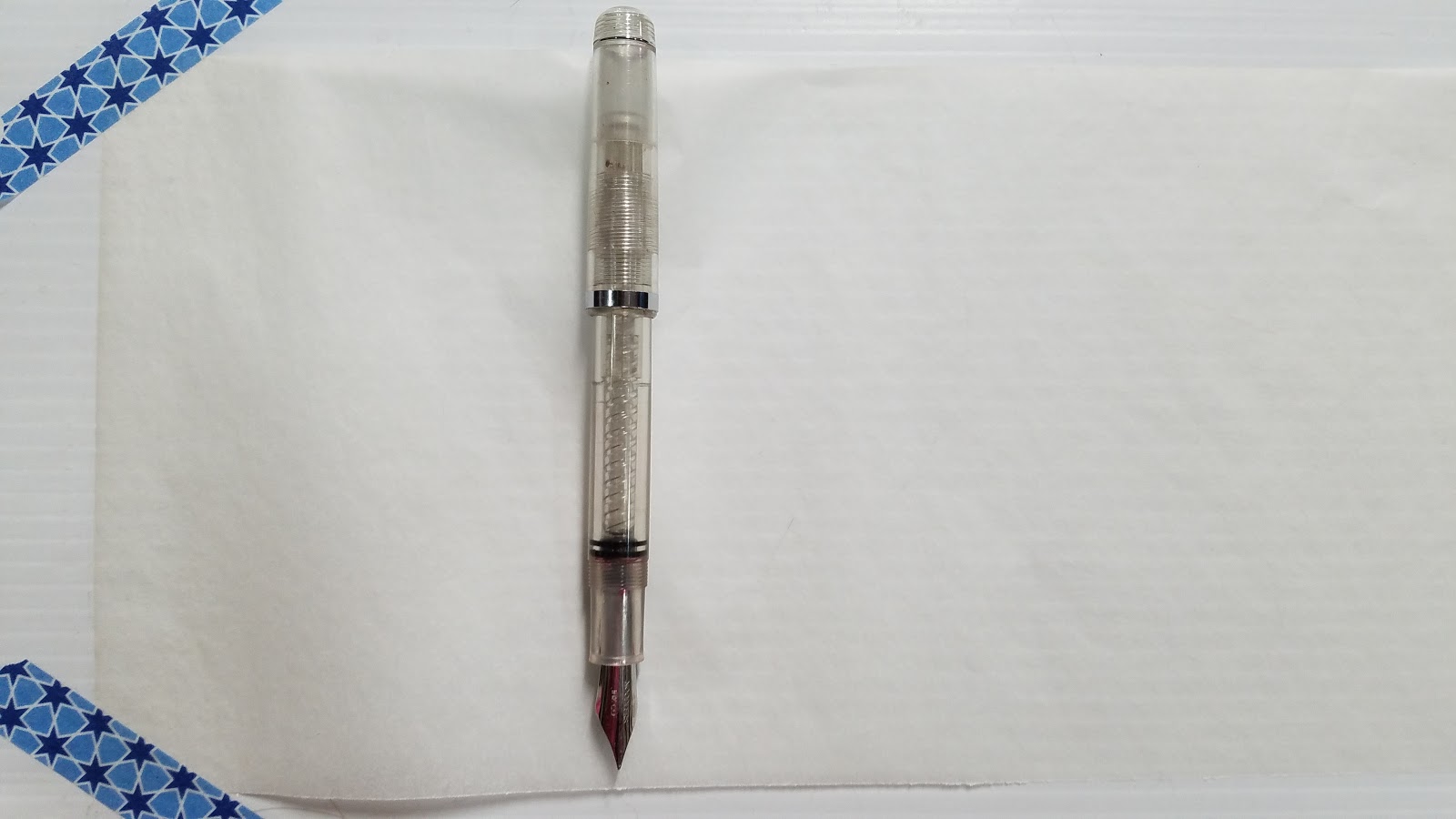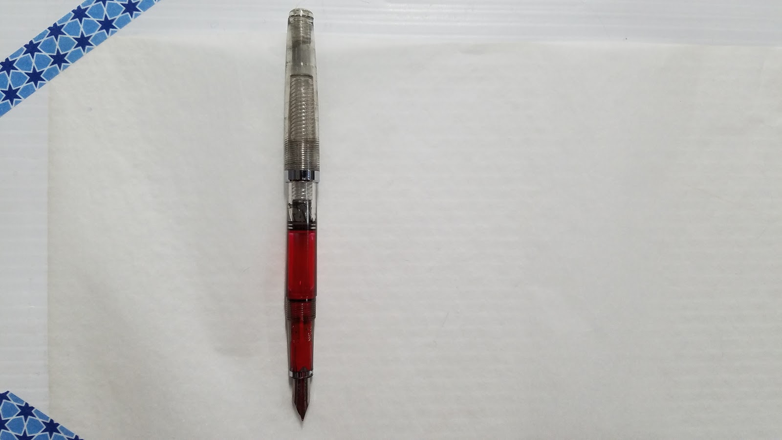 Unlike the Ahab, the Konrad has a piston fill system- remove the back cap by unscrewing it, then screw the knob on the back to extend and retract the piston mechanism to draw ink up into your pen.