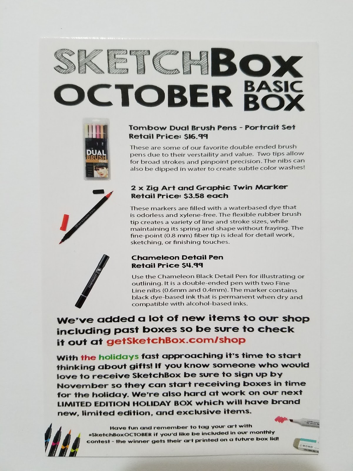 So here's the skinny: In all the hustle and bustle of October (Special Edition ArtSnacks Inktober Box, bringing the October ArtSnacks and Sketchbox with me to San Jose, being in San Jose for a week, tabling at APE), not only did I NOT write the September ArtSnacks V SketchBox post, but I also committed the biggest sin of all- I deleted the notes and the photos.
